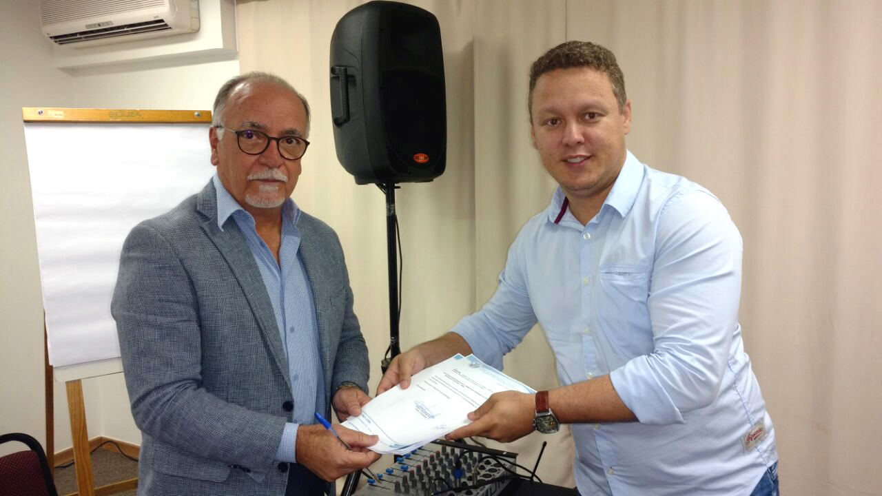 Presidente do SEECETHAR, Valdenir Ferreira da Silva, entrega a pauta de reivindicações unificada dos trabalhadores em edifícios e condomínios ao presidente do Sindicond, José Luiz Bregaida