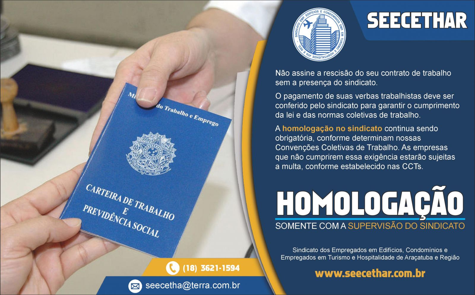A homologação no sindicato continua sendo obrigatória, conforme determinam nossas Convenções Coletivas de Trabalho. As empresas que não cumprirem essa exigência estarão sujeitas a multa, conforme estabelecido nas CCTs.