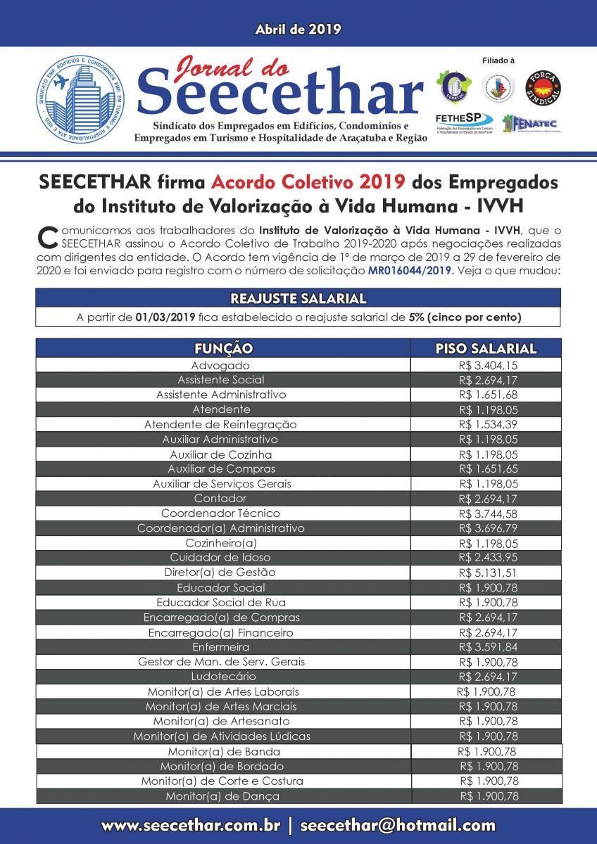 Comunicamos aos trabalhadores do Instituto de Valorização à Vida Humana - IVVH, que o SEECETHAR assinou o Acordo Coletivo de Trabalho 2019-2020 após negociações realizadas com dirigentes da entidade. O Acordo tem vigência de 1º de março de 2019 a 29 de fevereiro de 2020 e foi enviado para registro com o número de solicitação MR016044/2019. Confira a circular e veja o que mudou: