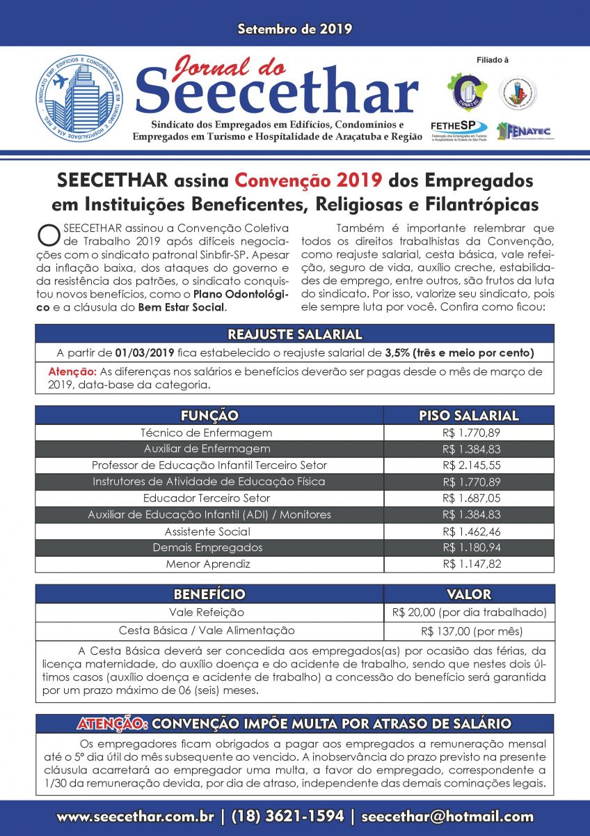 O SEECETHAR assinou a Convenção Coletiva de Trabalho 2019-2020 dos Trabalhadores em Instituições Beneficentes, Religiosas e Filantrópicas de Araçatuba e Região após difíceis negociações com o sindicato patronal Sinbfir-SP. Apesar da inflação baixa, dos ataques do governo e da resistência dos patrões, o sindicato conquistou novos benefícios, como o Plano Odontológico e a cláusula do Bem Estar Social.