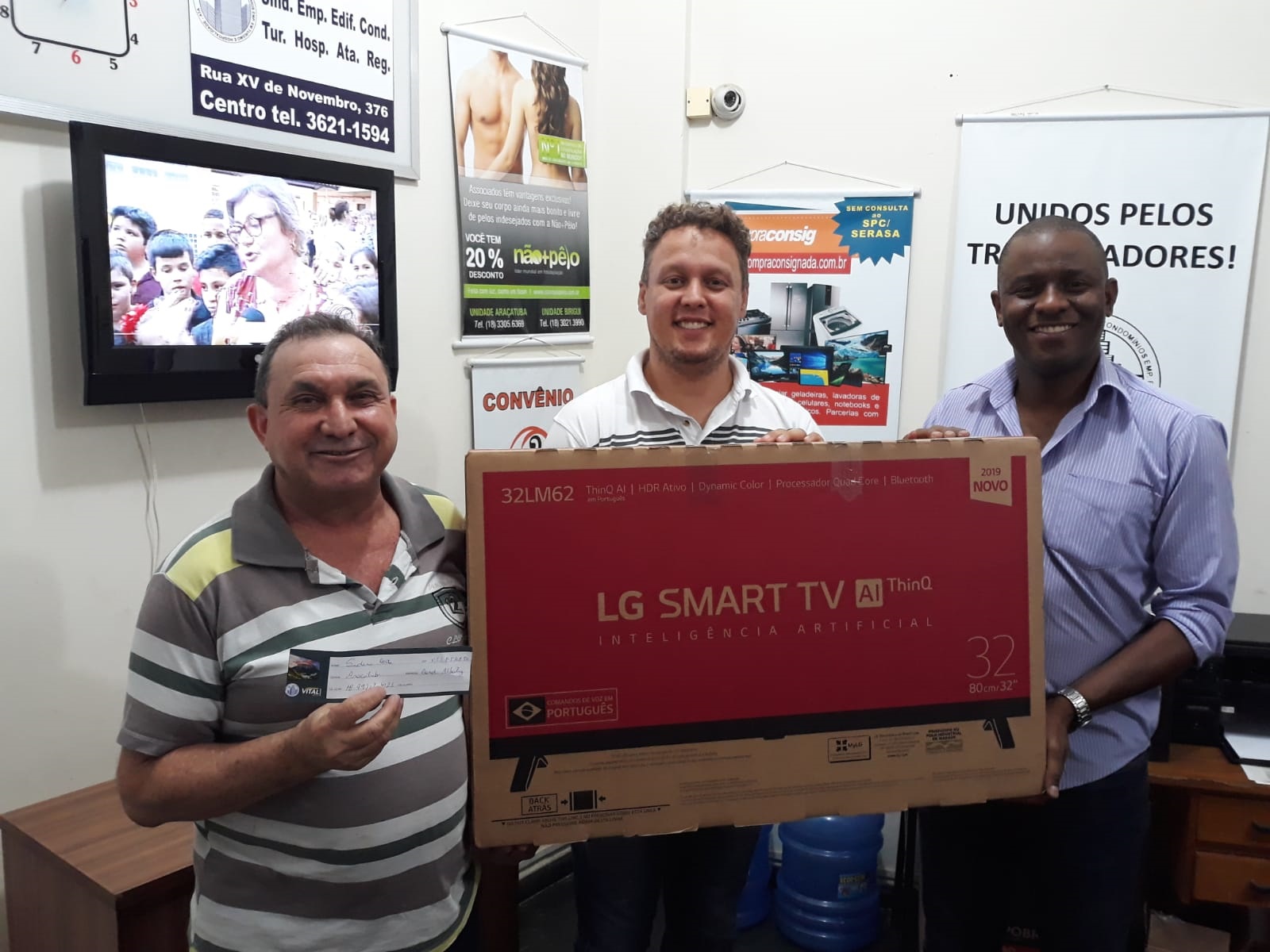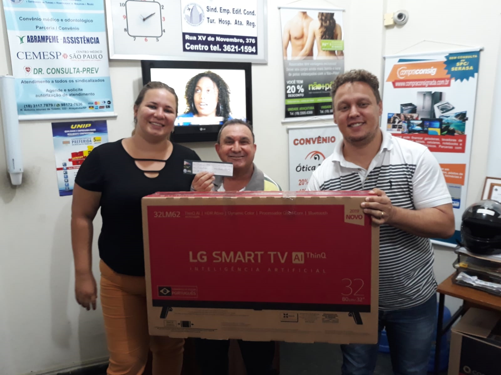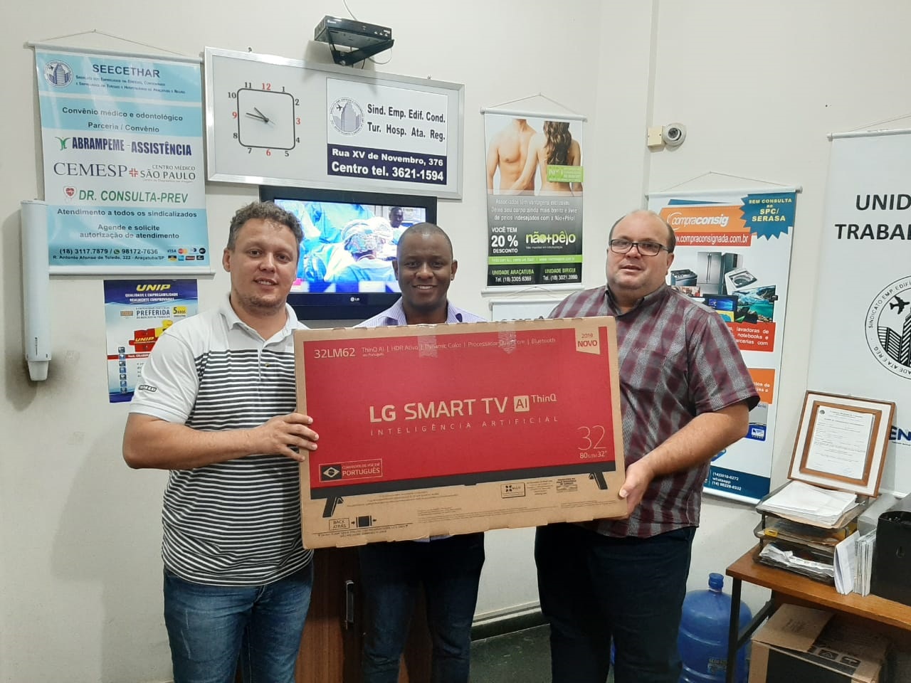 O SEECETHAR premiou, na quinta-feira (03/10), o trabalhador do Condomínio Albatroz, Sidini Aparecido da Costa, com uma novíssima Smart TV de 32 polegadas, da LG.