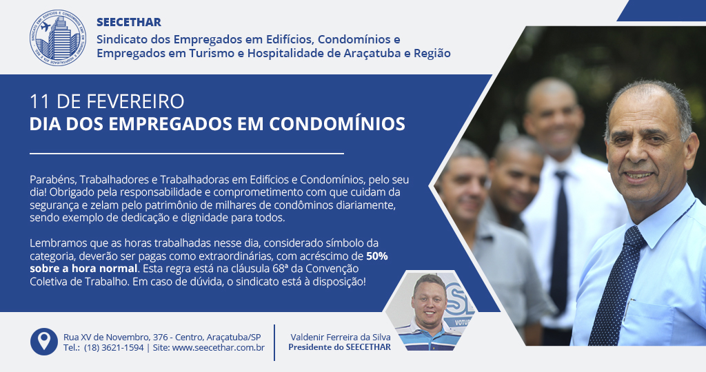 Parabéns, Trabalhadores e Trabalhadoras em Edifícios e Condomínios, pelo seu dia! Obrigado pela responsabilidade e comprometimento com que cuidam da segurança e zelam pelo patrimônio de milhares de condôminos diariamente, sendo exemplo de dedicação e dignidade para todos.