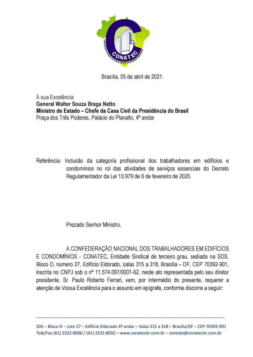 A Confederação Nacional dos Trabalhadores em Edifícios e Condomínios (CONATEC), entidade sindical de terceiro grau, da qual o SEECETHAR é filiado, enviou, nesta segunda-feira (0504), ofício à Presidência da República pedindo prioridade na vacinação contra a Covid-19 para trabalhadores em edifícios e condomínios. No ofício, a entidade pede a inclusão da categoria no rol de serviços essenciais do decreto regulamentador da Lei 13.979/2020.