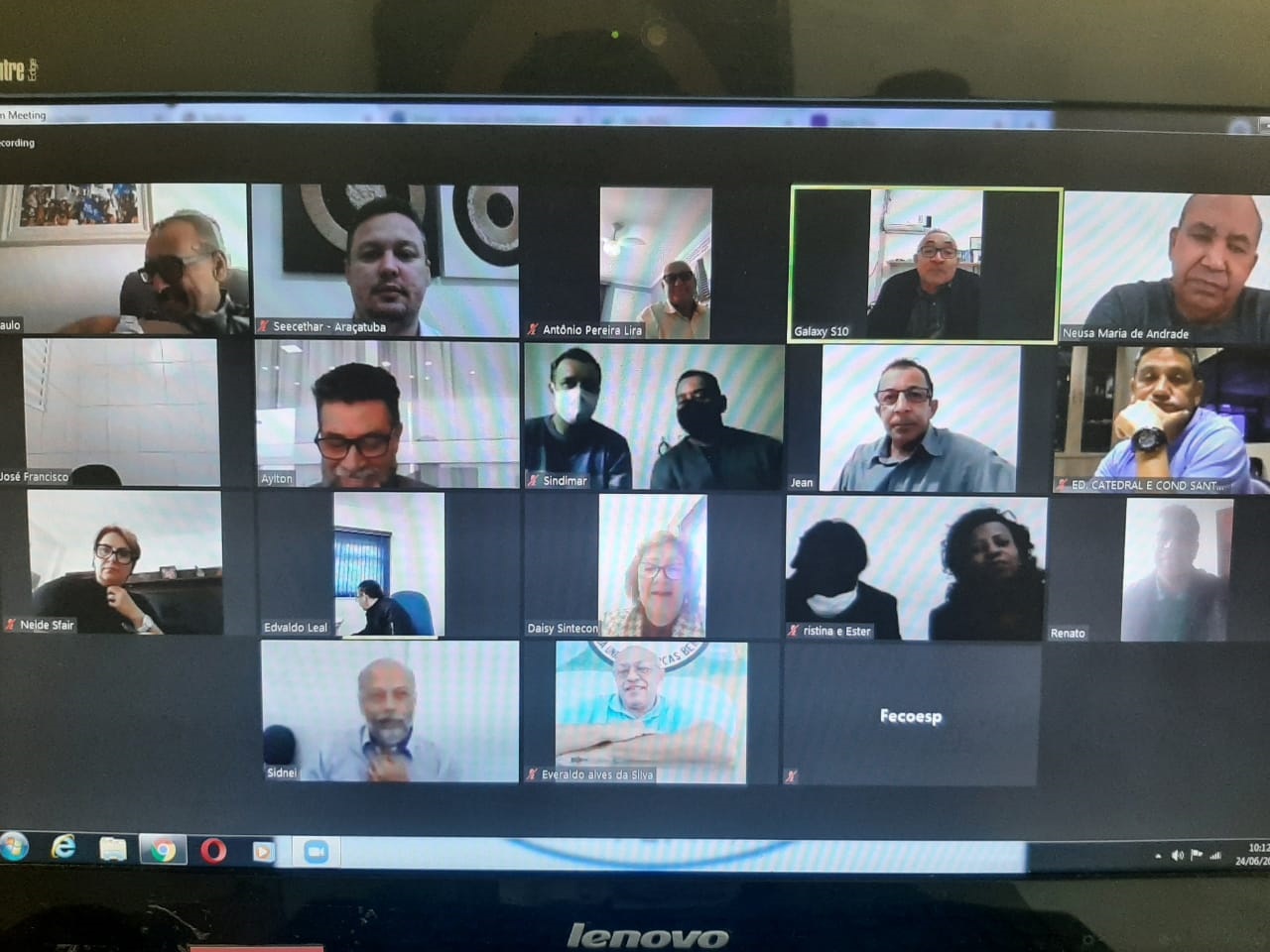 Participaram da videoconferência o presidente do SEECETHAR, Valdenir Ferreira da Silva, e dirigentes da FECOESP (Federação dos Empregados em Edifícios e Condomínios do Estado de São Paulo) e de seus sindicatos filiados.