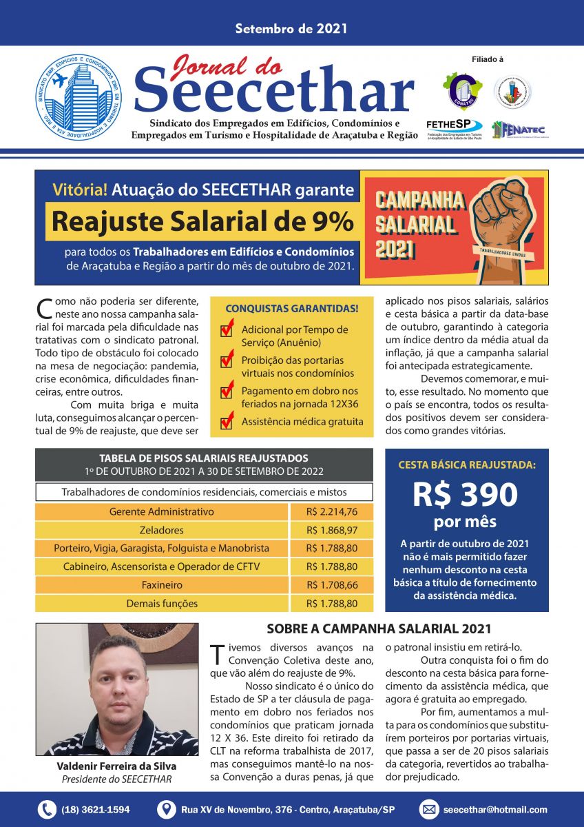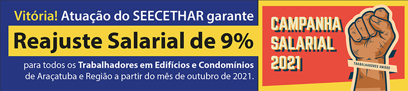 O SEECETHAR assinou a Convenção Coletiva de Trabalho 2021-2022 dos Empregados em Edifícios e Condomínios de Araçatuba e Região, que tem data-base em outubro de 2021. A nova Convenção tem vigência de 1º de outubro de 2021 a 30 de setembro de 2022.