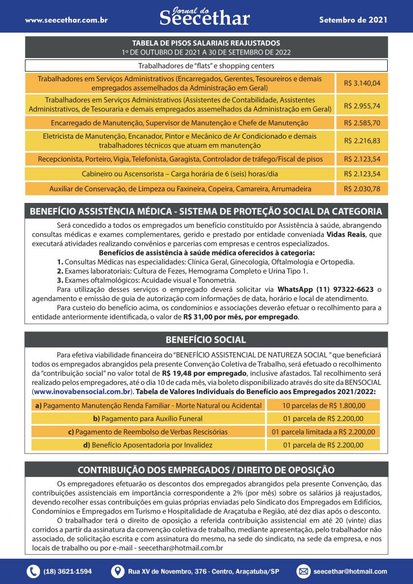 O valor da cesta básica, a ser fornecida gratuitamente a todos os trabalhadores até o 5º dia útil do mês, passa a ser de R$ 390,00. A partir de outubro de 2021 não é mais permitido fazer nenhum desconto na cesta básica a título de fornecimento da assistência médica. A Cesta Básica é assegurada a todos os trabalhadores no período de afastamento médico, por motivo de doença limitado ao período de 06 (seis) meses, bem como no período de férias, auxílio maternidade e auxílio paternidade.
