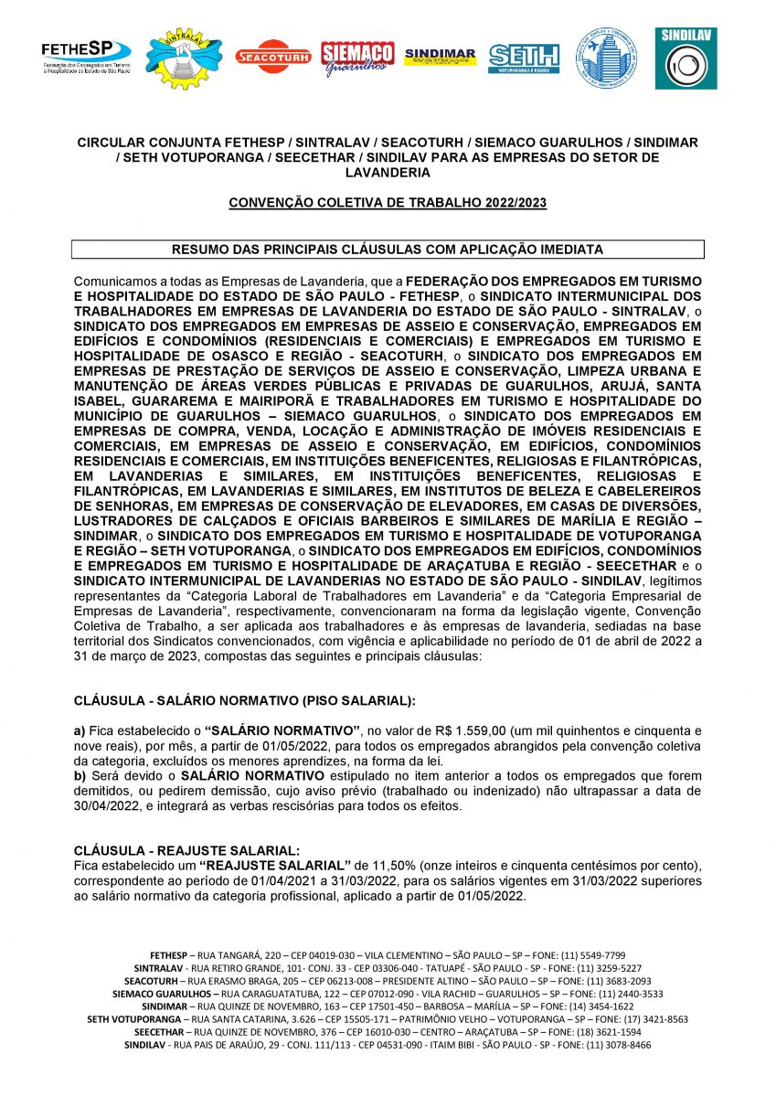 Após uma extensa e difícil negociação coletiva com o setor patronal, o SEECETHAR assinou, com apoio da FETHESP, a Convenção Coletiva de Trabalho 2022 dos empregados em lavanderias e similares de Araçatuba e região. A nova Convenção tem vigência de 1º de abril de 2022 a 31 de março de 2023 e será disponibilizada na íntegra em nosso site após registro junto ao Ministério do Trabalho. (Baixe aqui a Circular Conjunta com as principais cláusulas de aplicação imediata).