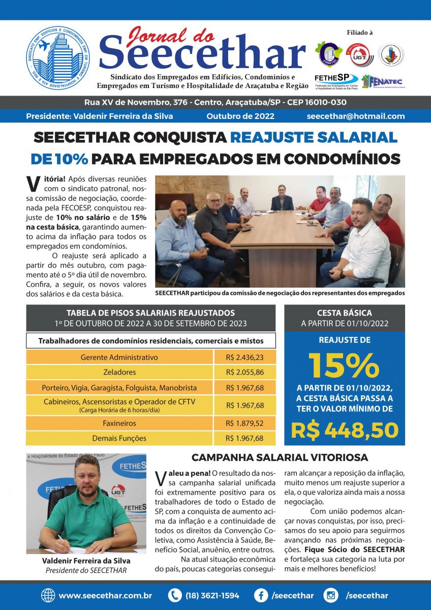 Confira a edição de outubro do nosso jornal, que traz todos os detalhes sobre o aumento salarial 2022 dos empregados em edifícios e condomínios de Araçatuba e região, representados pelo SEECETHAR.