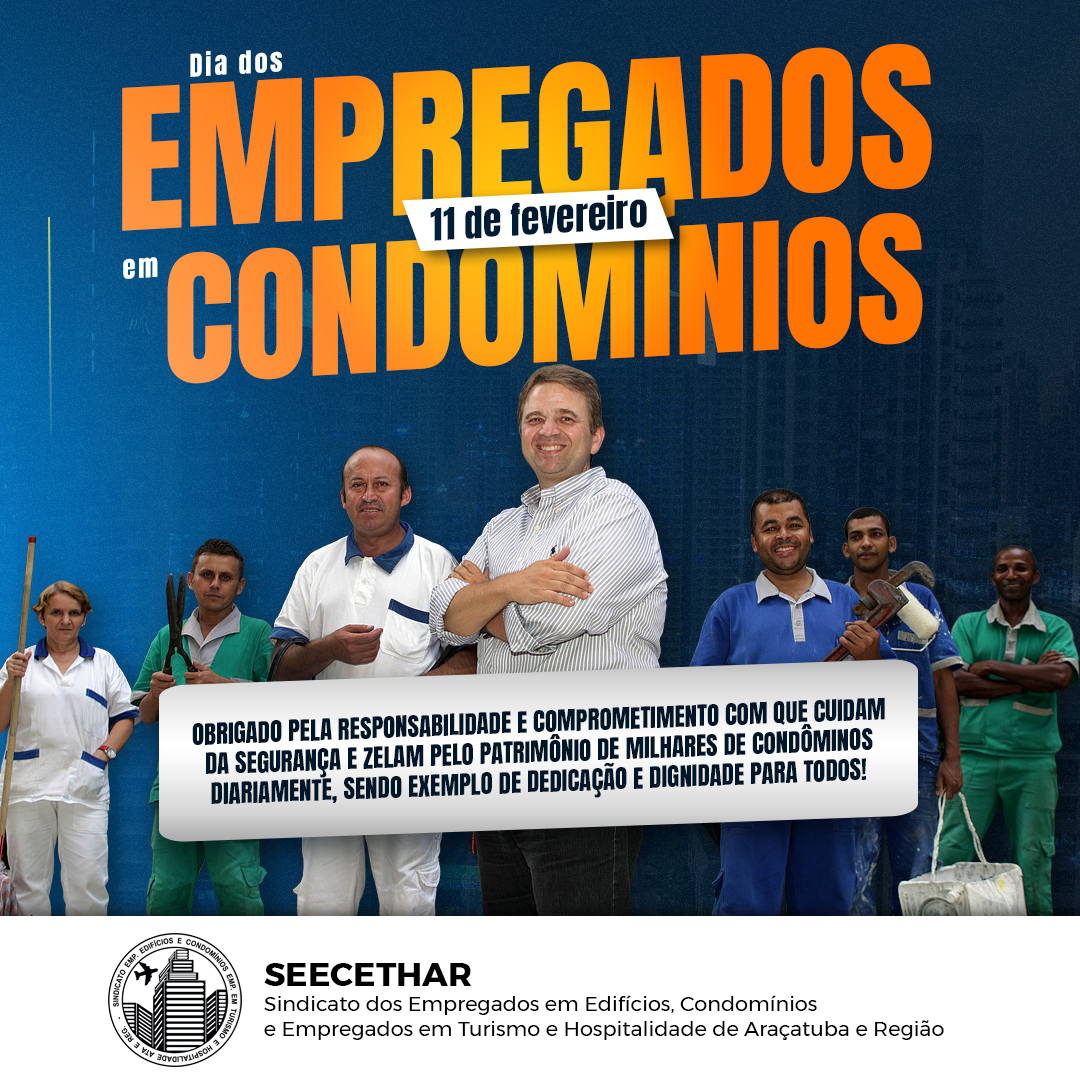 Conforme estabelece a Convenção Coletiva de Trabalho, 11 de fevereiro é o Dia dos Empregados em Edifícios e Condomínios. Nesta data lembramos o quanto são importantes as funções destes Profissionais, mantenedores da segurança, ordem e limpeza de milhares de lares, e encarregados de, acima de tudo, cuidar do patrimônio, da paz e da tranquilidade de milhares de pessoas e famílias.