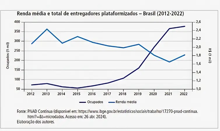Os dados citados foram apurados no estudo Plataformização e precarização do trabalho de motoristas e entregadores no Brasil, do Instituto de Pesquisa Econômica Aplicada (Ipea), a partir de dados do Instituto Brasileiro de Geografia e Estatística (IBGE) - Pesquisa Nacional por Amostra Domicílios Contínua (Pnad). Tanto para motoristas quanto para entregadores, a média dos rendimentos dos trabalhadores inscritos nas plataformas era inicialmente superior à média dos ocupados em atividades semelhantes.
