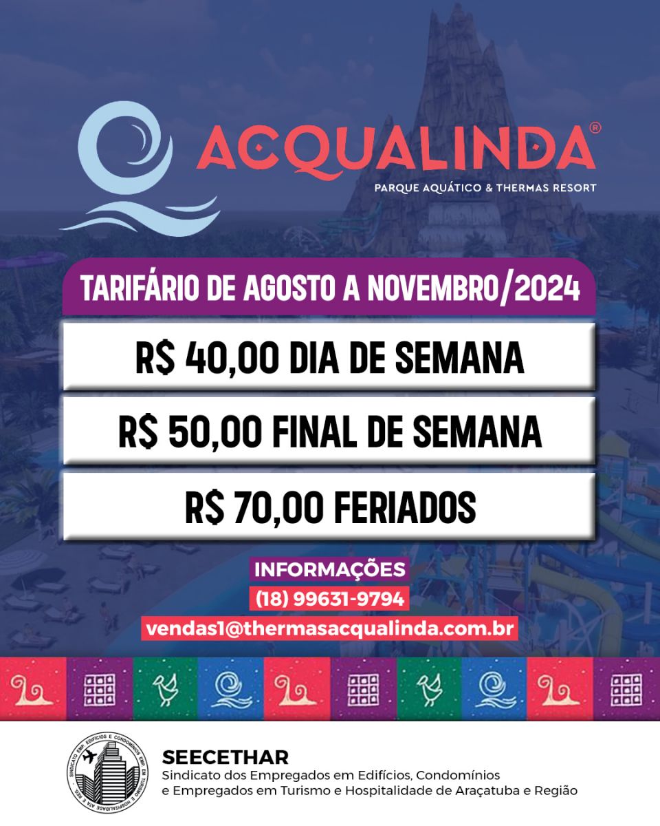 Associados(as) ao SEECETHAR têm direito a preços promocionais nos ingressos para o Parque Aquático Thermas Acqualinda para todos os dias da semana. Confira o tarifário para os meses de agosto a novembro de 2024: