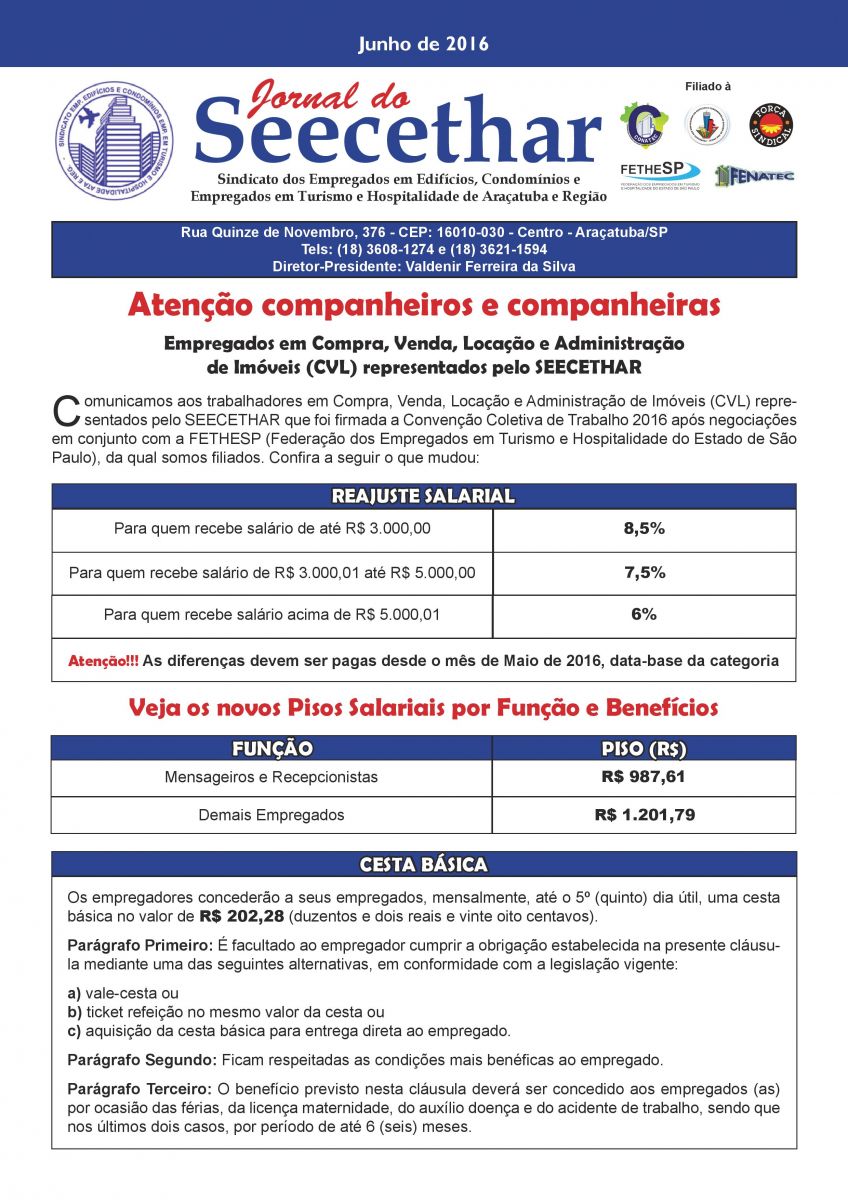 O SEECETHAR concluiu, em conjunto com a FETHESP (Federação dos Empregados em Turismo e Hospitalidade do Estado de São Paulo), a negociação da Convenção Coletiva de Trabalho 2016 dos empregados em Compra, Venda, Locação e Administração de Imóveis (CVL) de Araçatuba e Região.