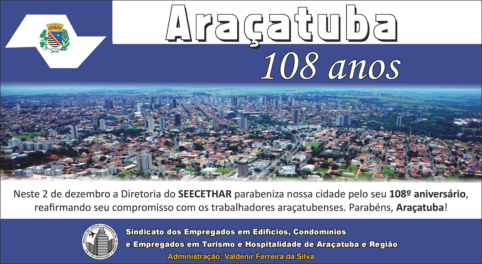 No dia 2 de dezembro nossa cidade completa 108 anos de história e o SEECETHAR parabeniza e agradece a seus moradores nesta data especial