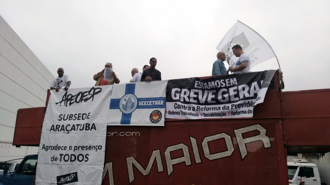 Houve grande adesão à greve em centenas de cidades em todo o País. Em Araçatuba, o SEECETHAR se uniu aos demais sindicatos da região e, juntos, realizamos uma passeata pelas principais vias da cidade. É muito importante sabermos que as reformas precarizam enormemente as condições de trabalho no Brasil e inviabilizam a aposentadoria, principalmente para as pessoas mais pobres e que mais necessitam desse direito fundamental.