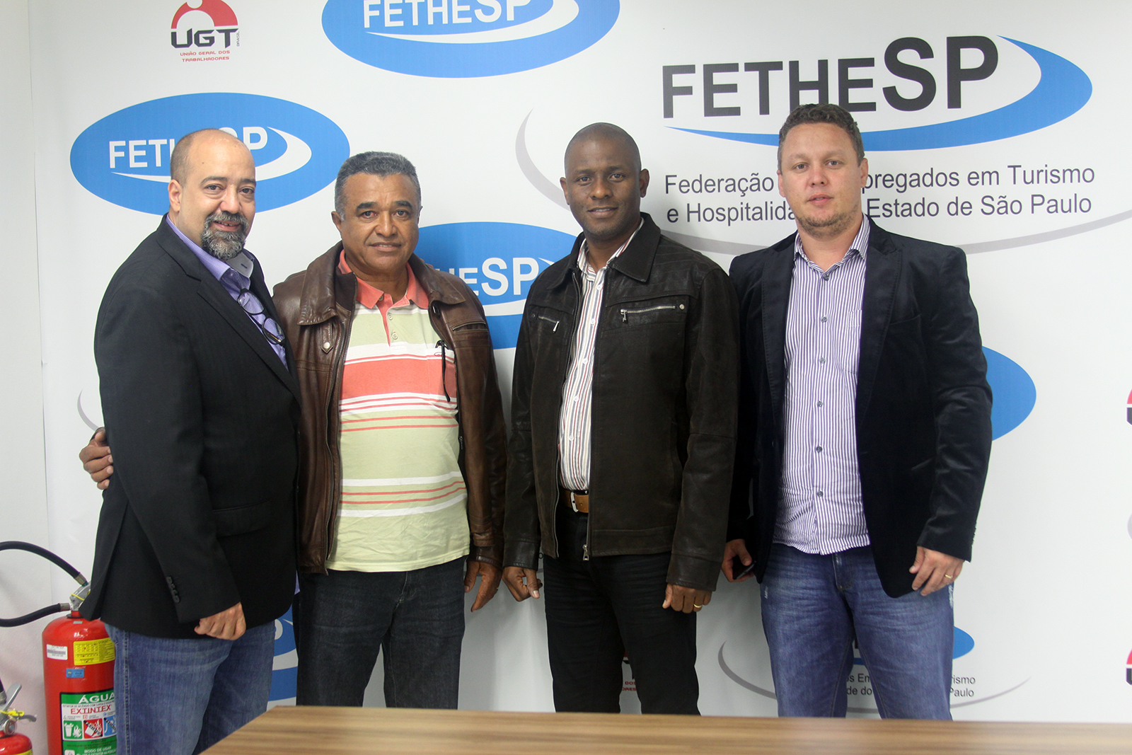 Rogério Gomes, presidente da FETHESP; Antônio Caneli, presidente do SETH Votuporanga; Alexsandro da Cruz Pereira, diretor do SEECETHAR; e Valdenir Ferreira da Silva, presidente do SEECETHAR