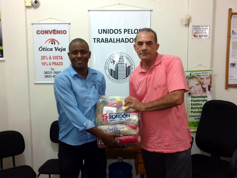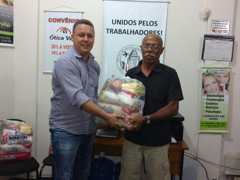 Companheiro José Santana, trabalhador do Condomínio Bela Vista, recebe a cesta básica do presidente do SEECETHAR, Valdenir Ferreira da Silva