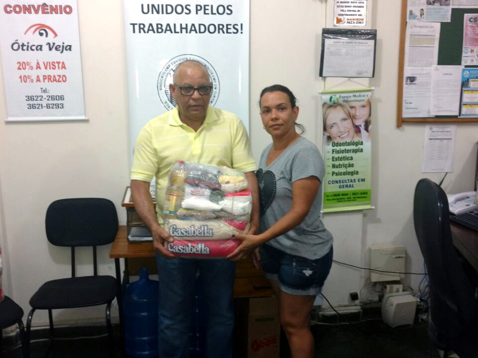 Companheira Elaine dos Santos, trabalhadora do Asilo São Vicente de Paulo, recebe a cesta básica do vice-presidente do SEECETHAR, José Roque Caetano Alves