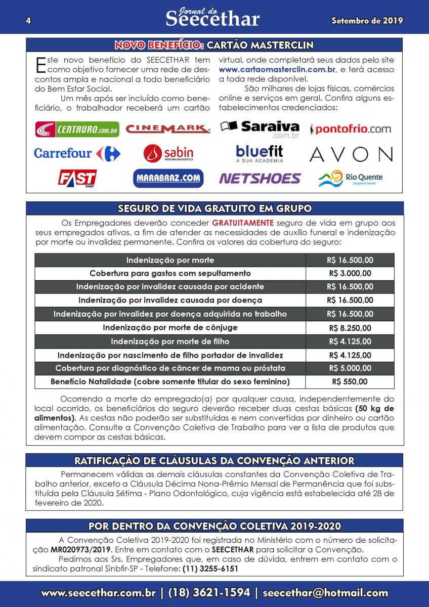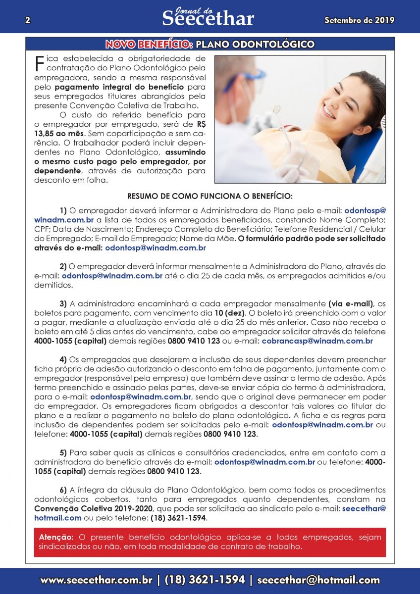 6) A íntegra da cláusula do Plano Odontológico, bem como todos os procedimentos odontológicos cobertos, tanto para empregados quanto dependentes, constam na Convenção Coletiva 2019-2020, que pode ser solicitada ao sindicato pelo e-mail: seecethar@hotmail.com ou pelo telefone: (18) 3621-1594.