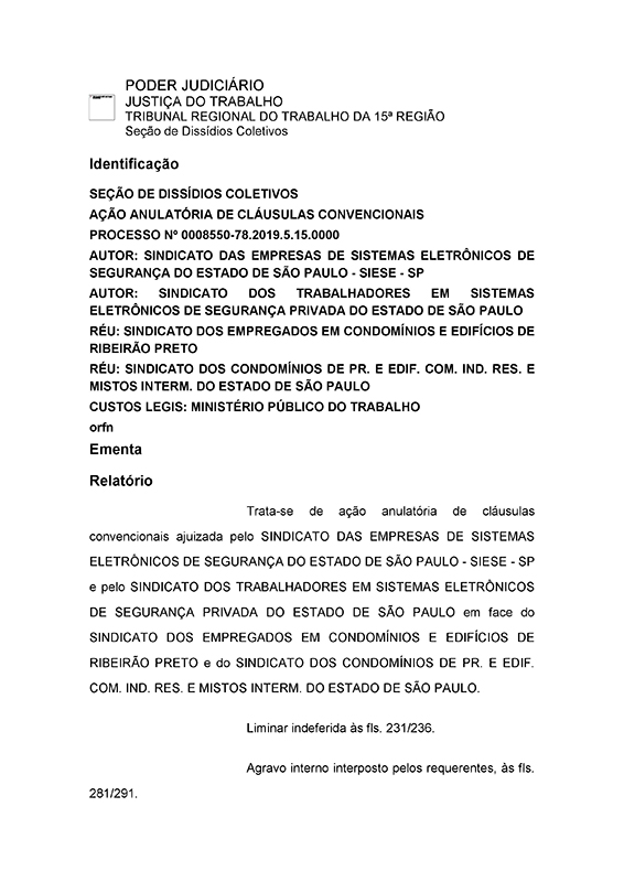 A cláusula havia sido questionada por entidades sindicais do ramo de sistemas eletrônicos de segurança, que ajuizaram ação anulatória de cláusulas convencionais, em face dos sindicatos profissional e patronal da área de condomínios de Ribeirão Preto, alegando, entre outras coisas, que a proibição fere a livre concorrência e a livre iniciativa.