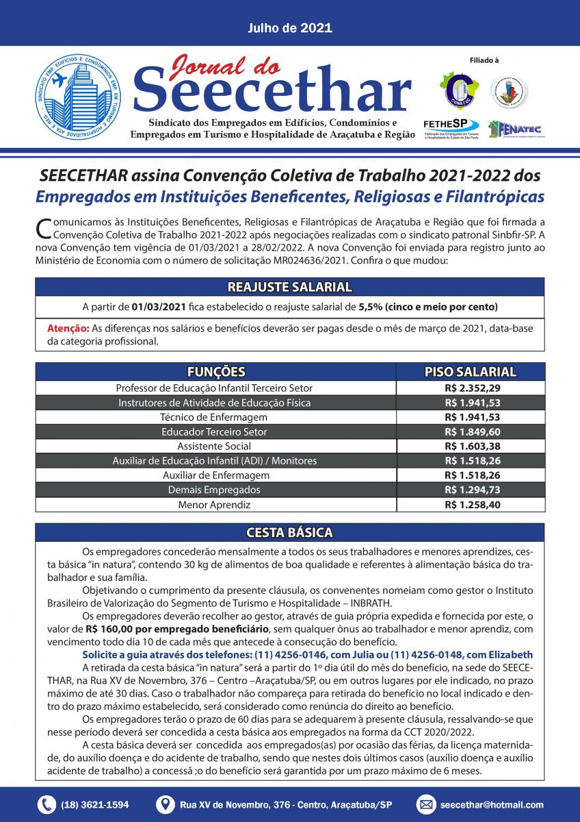 O SEECETHAR assinou, na quarta-feira (23/06) a Convenção Coletiva de Trabalho 2021-2022 dos Trabalhadores em Instituições Beneficentes, Religiosas e Filantrópicas (Terceiro Setor) de Araçatuba e região, após negociações realizadas com o sindicato patronal Sinbfir-SP. A nova convenção tem vigência de 1º de março de 2021 a 28 de fevereiro de 2022.