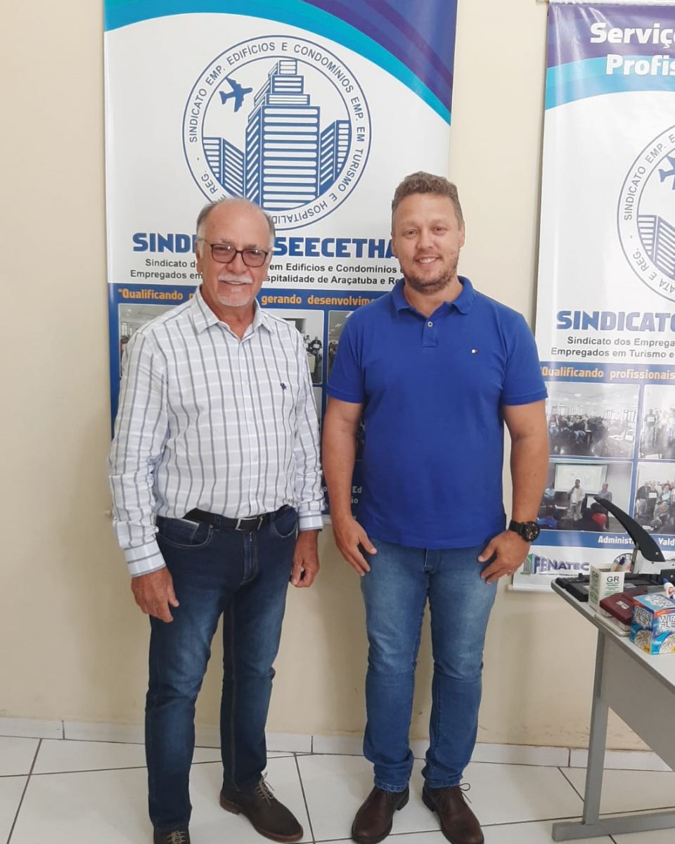 O presidente do SEECETHAR, Valdenir Ferreira da Silva, recebeu, nesta quinta-feira (19/01), a visita do presidente do Sindicato dos Condomínios do Estado de São Paulo (SINDICOND), José Luiz Bregaida, em Araçatuba/SP. Os sindicalistas discutiram melhorias para a categoria dos empregados em edifícios e condomínios para o ano de 2023.