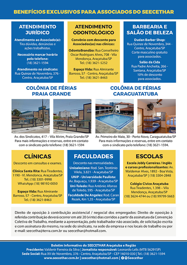 Ficaram mantidas todas as demais cláusulas da Convenção Coletiva anterior, que garantem ao trabalhador benefícios como Adicional Noturno de 50% sobre a hora normal; Auxílio ao filho portador de necessidade especial; Pagamento de ajuda de custo mensal de R$ 127,00 aos empregados que trabalham em regime de home office; Estabilidades de emprego diversas; entre outros direitos que não são assegurados pela CLT nem por leis, mas somente pelo trabalho de negociação feito pelo SEECETHAR.