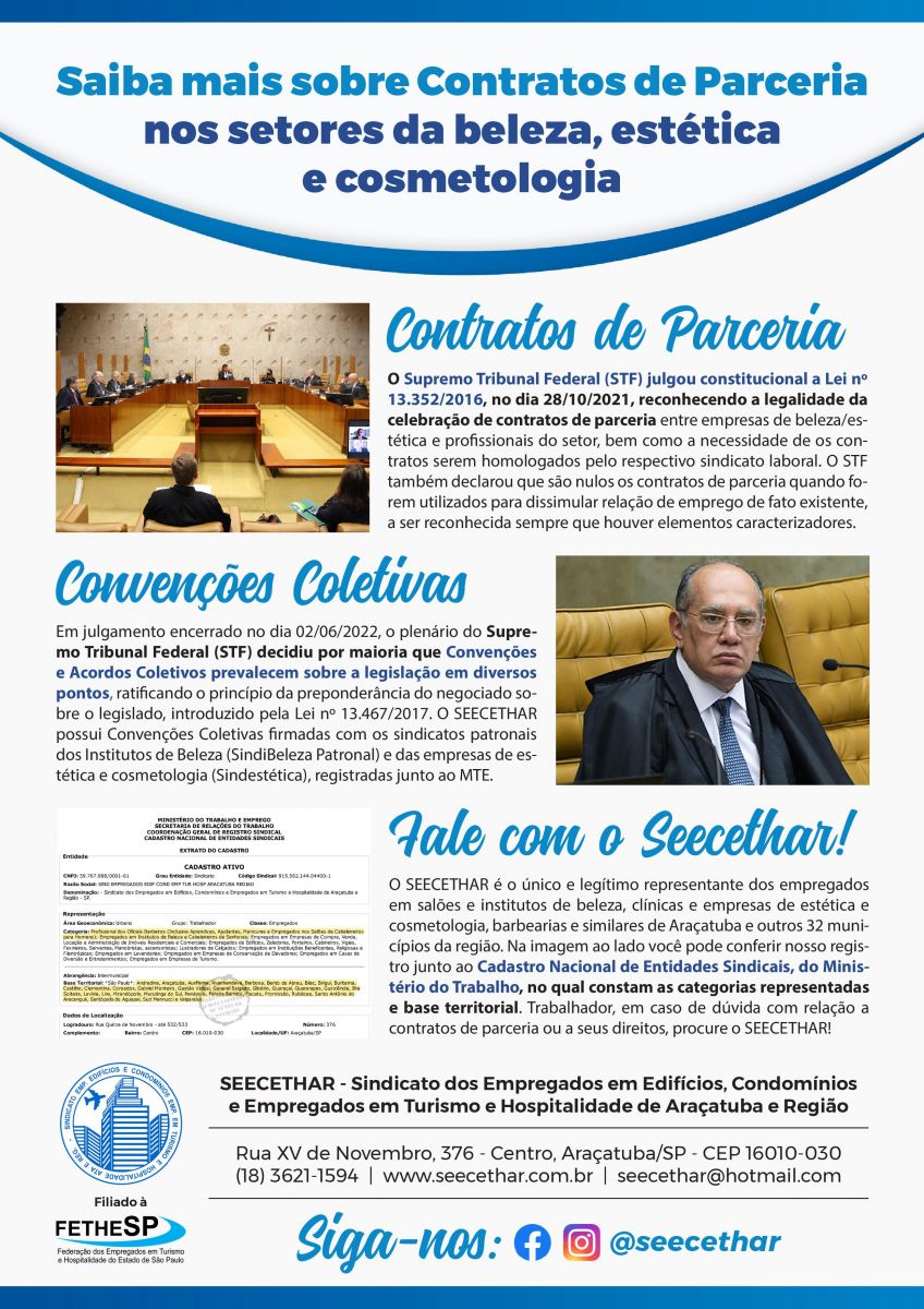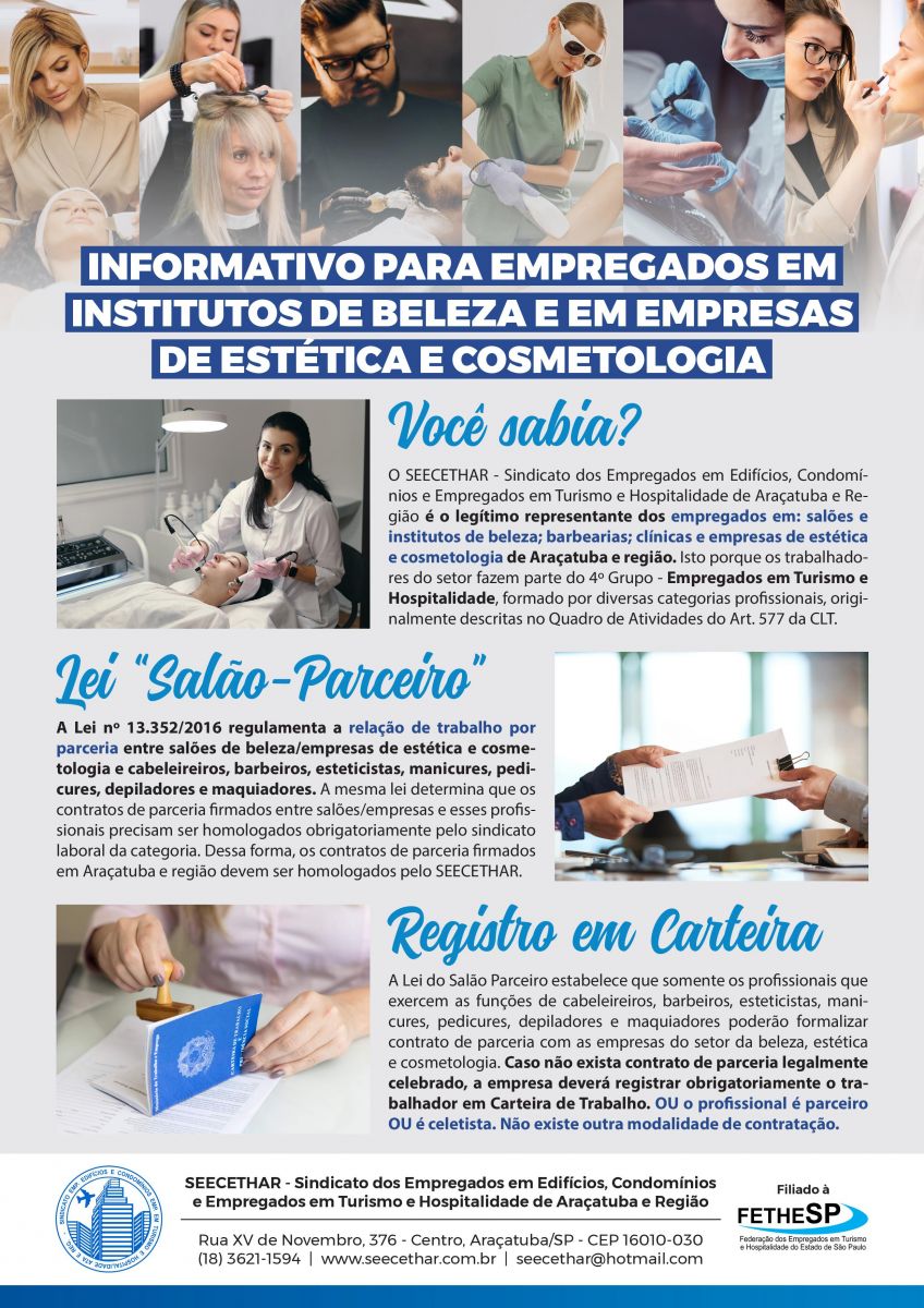 Reforçamos, ainda, que o SEECETHAR é o ÚNICO e LEGÍTIMO representante dos empregados em salões e institutos de beleza, barbearias, clínicas e empresas de estética e cosmetologia de Araçatuba e região. Celebramos Convenções Coletivas de Trabalho com os sindicatos patronais dos Institutos de Beleza (SindiBeleza Patronal) e das empresas de estética e cosmetologia (Sindestética), que podem ser solicitadas pelo e-mail: seecethar@hotmail.com