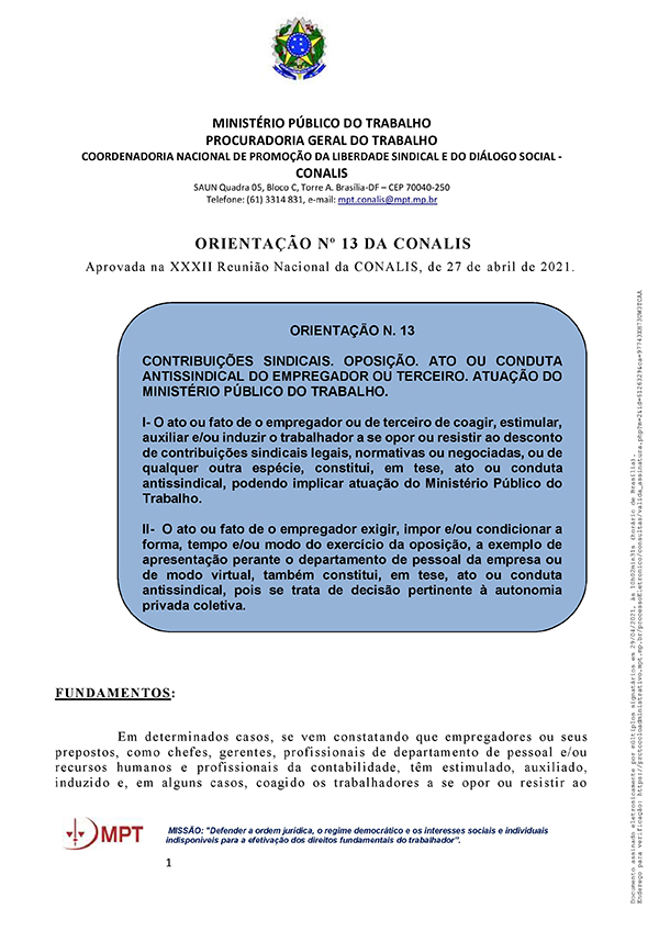 O Ministério Público do Trabalho (MPT) criou uma nota, denominada Orientação nº 13, indicando ser considerado ato contra o direito e a liberdade sindical qualquer tipo de auxílio que as empresas ou escritórios de contabilidade forneçam aos empregados para apresentação de carta de oposição à contribuição assistencial.
