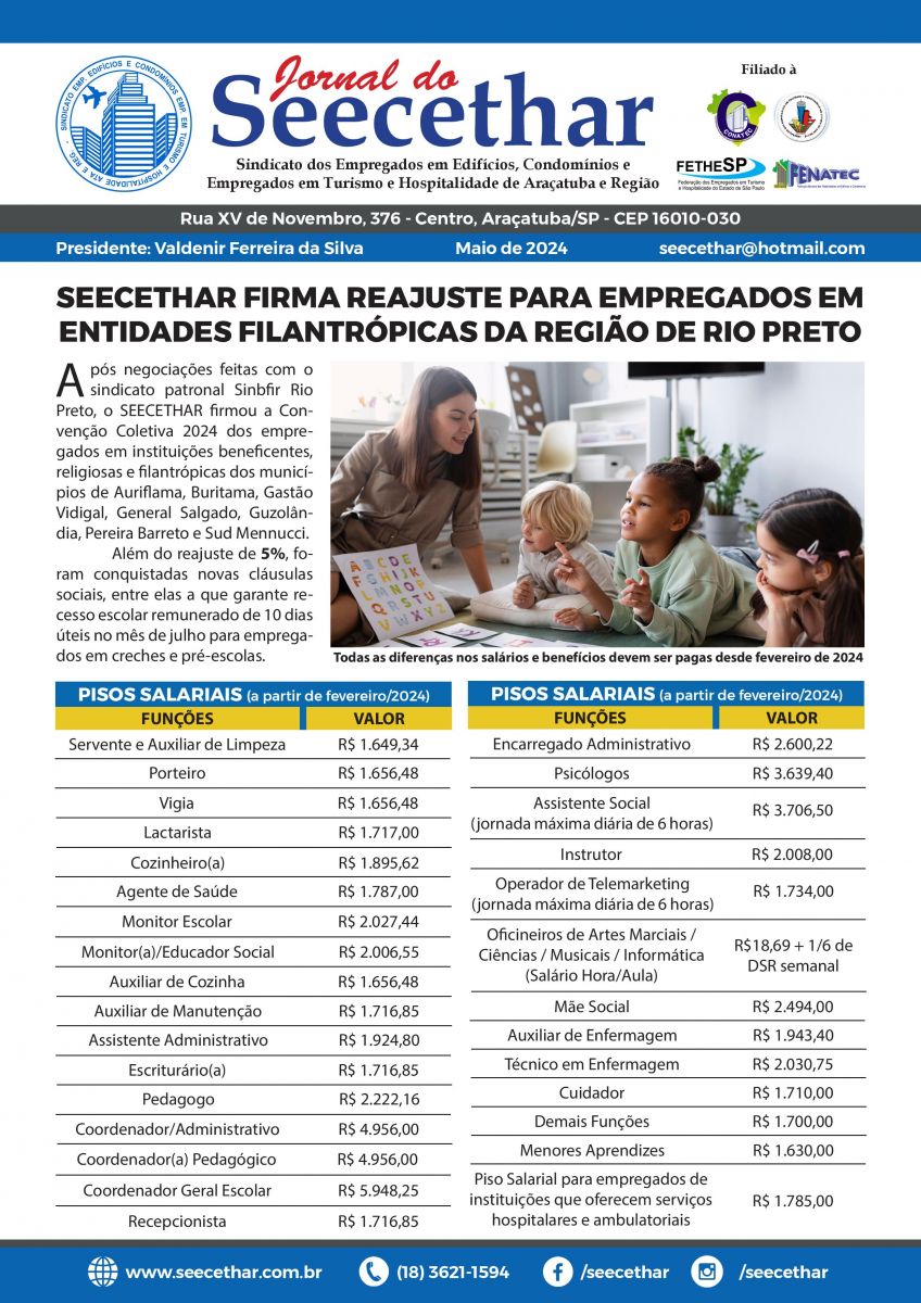 Após negociações feitas com o sindicato patronal Sinbfir Rio Preto, o SEECETHAR firmou a Convenção Coletiva 2024 dos empregados em instituições beneficentes, religiosas e filantrópicas dos municípios de Auriflama, Buritama, Gastão Vidigal, General Salgado, Guzolândia, Pereira Barreto e Sud Mennucci, garantindo o reajuste de 5% nos salários, pisos salariais e benefícios.