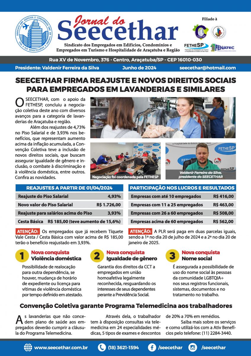 Com o apoio da FETHESP, o SEECETHAR firmou a Convenção Coletiva de Trabalho 2024 dos empregados em lavanderias e similares de Araçatuba e região, após negociações realizadas com o sindicato patronal Sindilav.