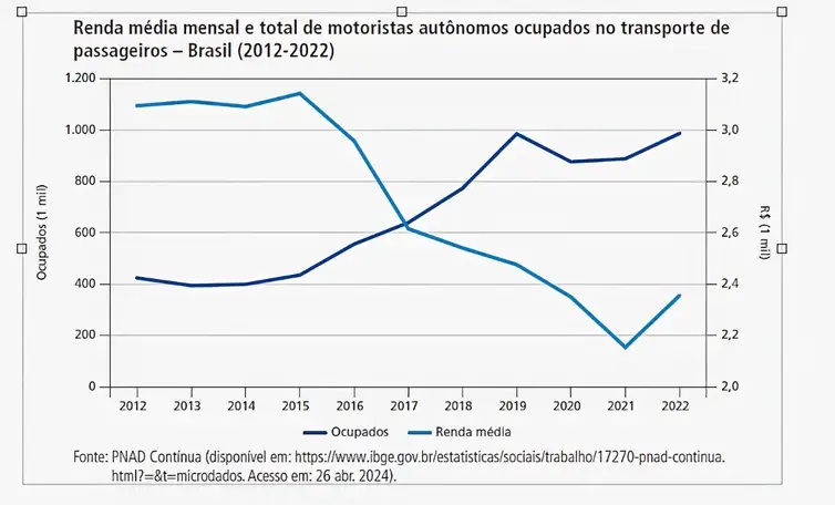 Nos períodos indicados, houve aumento do número de trabalhadores disponíveis. Entre 2012 e 2015, a oferta de mão de obra de motoristas autônomos no setor de transporte de passageiros era de cerca de 400 mil trabalhadores. Em 2022, o total de ocupados se aproximava de 1 milhão. Já o número de entregadores inscritos nas plataformas saltou de 56 mil para 366 mil entre 2015 e 2021.