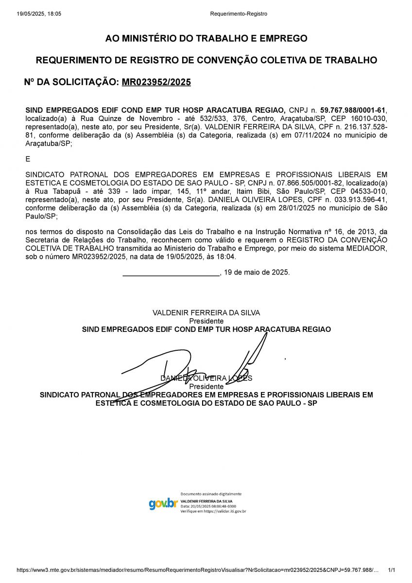 Requerimento de registro da Convenção Coletiva 2025 assinado pelas partes