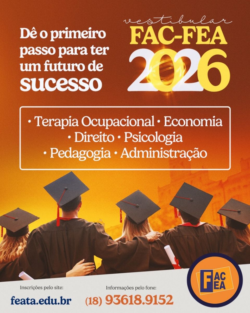 Entre as oportunidades apresentadas, está o Vestibular FAC-FEA 2026, que abre portas para quem deseja começar o ano investindo no conhecimento e construindo um futuro mais sólido. A faculdade oferece cursos em áreas de grande demanda no mercado, como Terapia Ocupacional, Economia, Direito, Psicologia, Pedagogia e Administração—carreiras que seguem em expansão e são fundamentais em diferentes setores da sociedade.