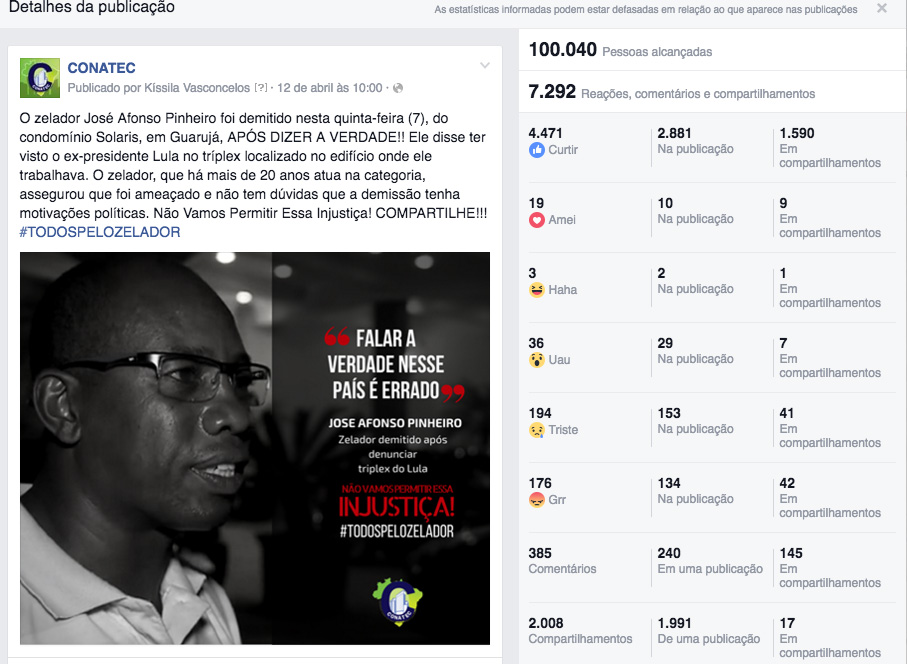 Mais de 4 mil reações, quase 2 mil compartilhamentos e 100 mil pessoas alcançadas. Essas foram as marcas da campanha lançada pela Conatec nas redes sociais em favor do zelador José Afonso Pinheiro, que foi demitido, no dia 7 de abril, do condomínio Solaris, em Guarujá, após prestar depoimento afirmando ter visto o ex-presidente Lula no tríplex localizado no edifício onde ele trabalhava.